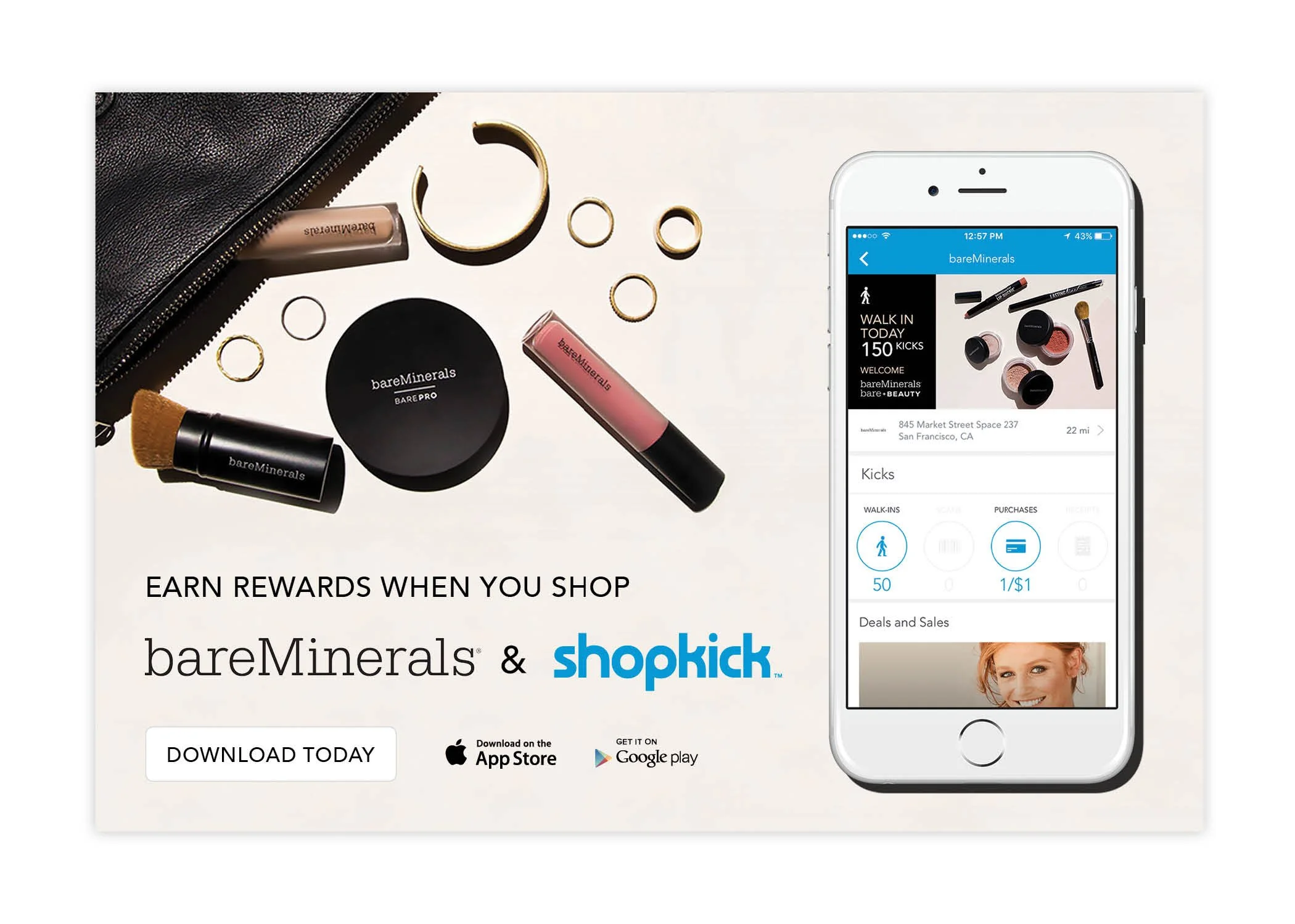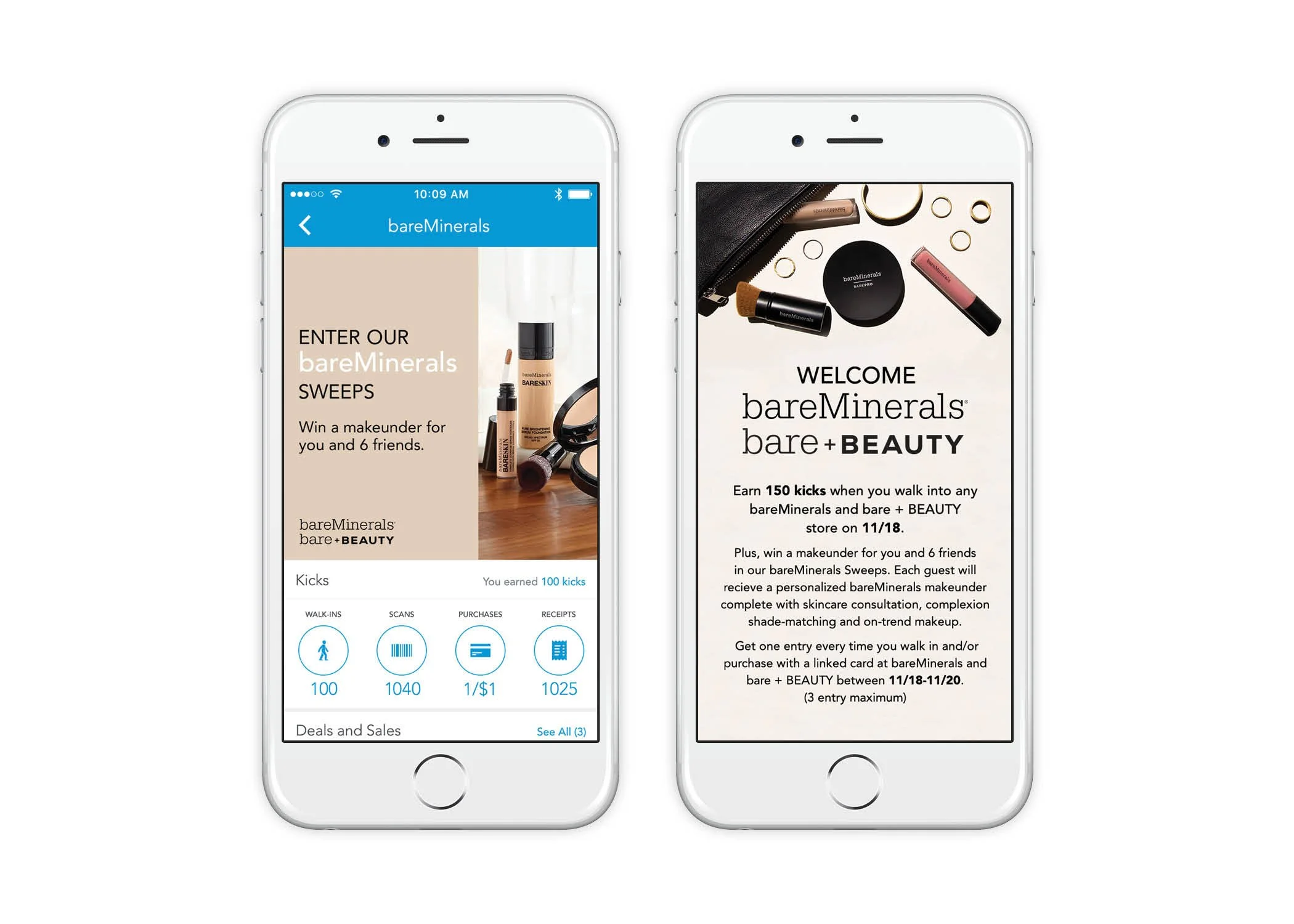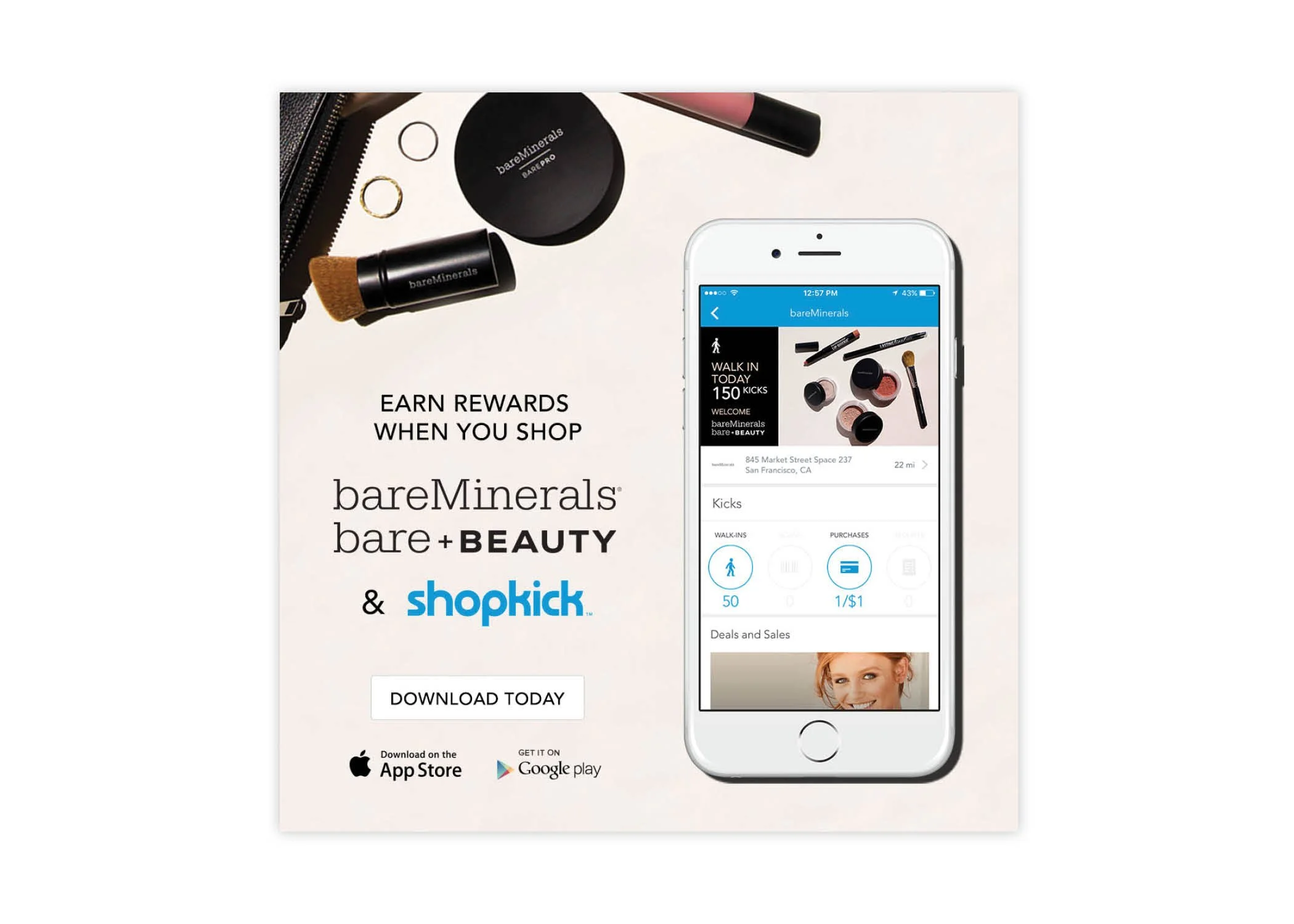 Create a cohesive campaign with bareMinerals with the Shopkick aesthetic. Also the main goal was to use provided imagery from bareMinerals. Also create a sweepstakes that was for Shopkick users.